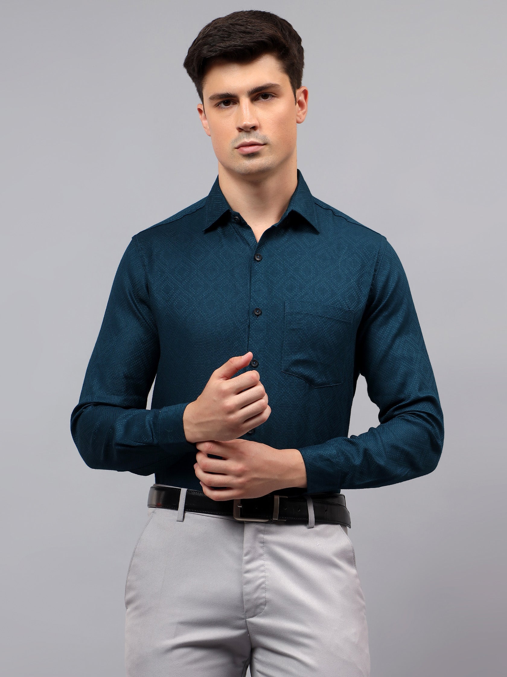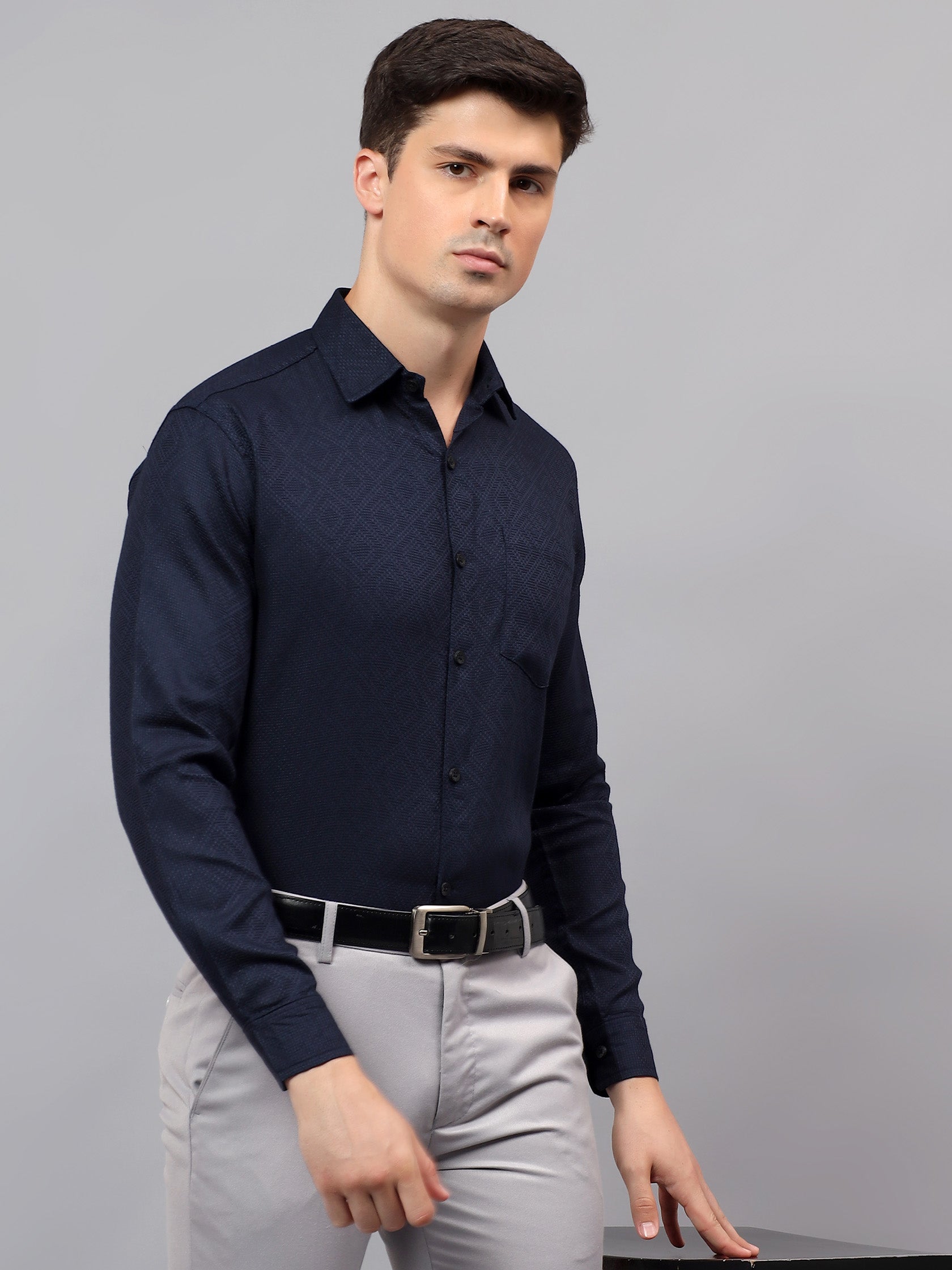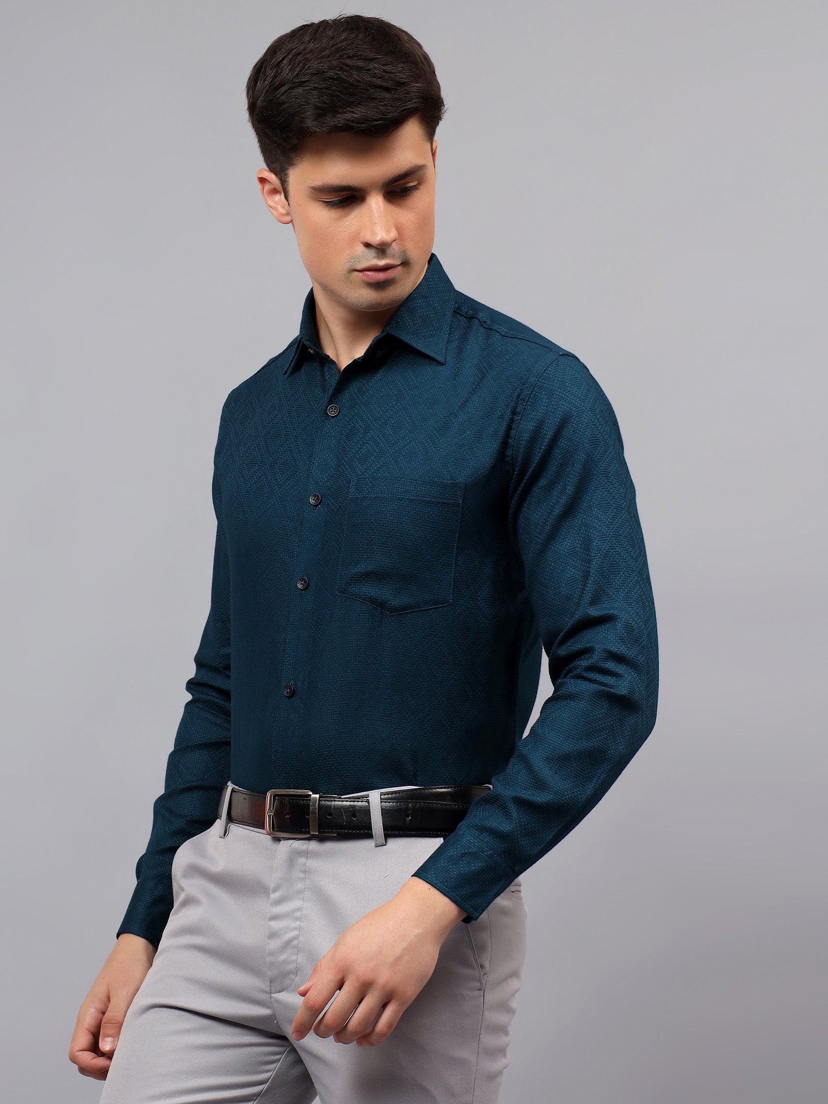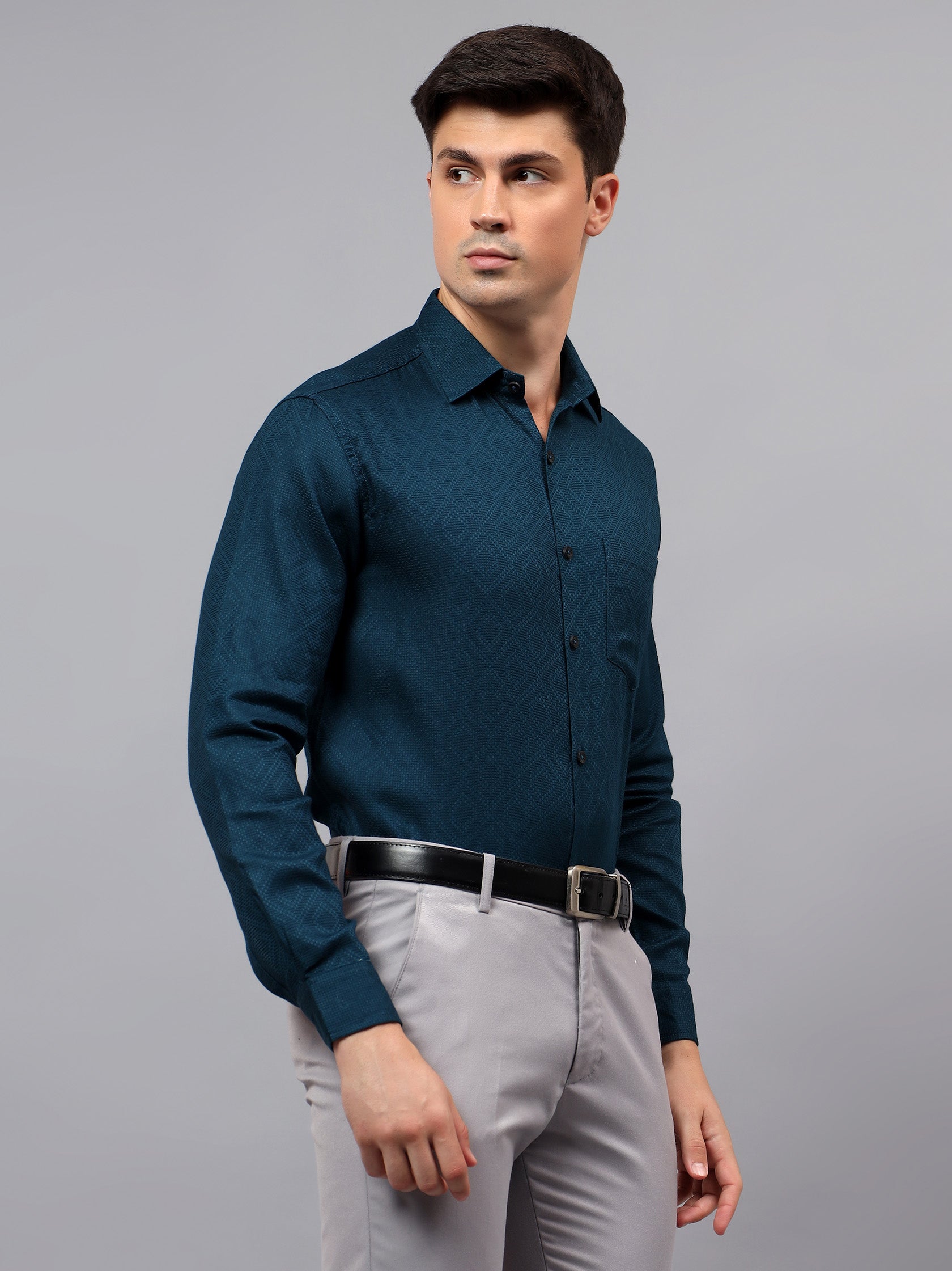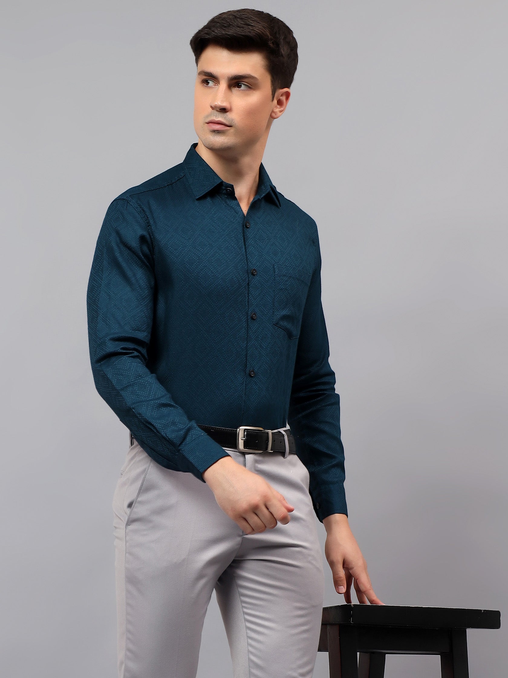 Upgrade your wardrobe with the Apektra Men's Regular Fit Full Sleeve Shirt, designed for both casual and semi-formal occasions. Crafted from a premium cotton, this shirt offers superior comfort, breathability, and durability. The sleek solid color with a stylish geometric pattern adds a touch of sophistication to your look.