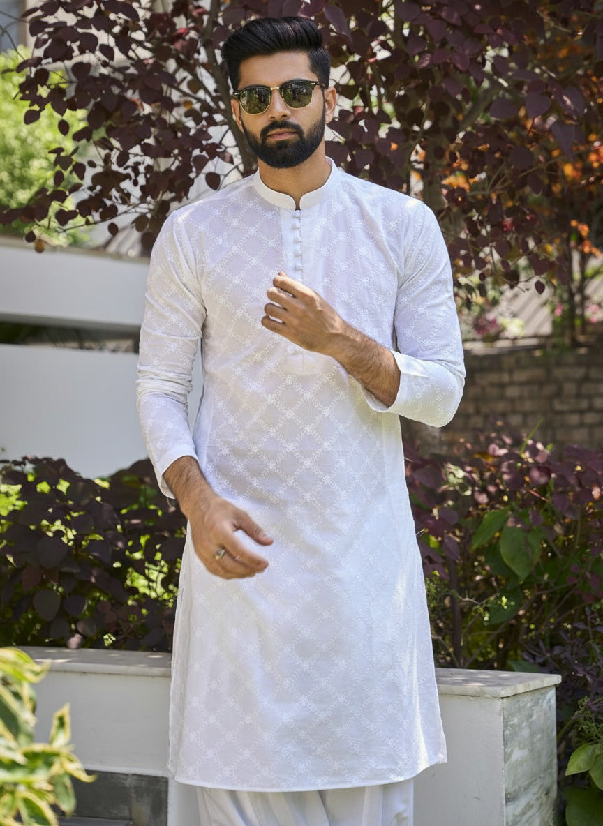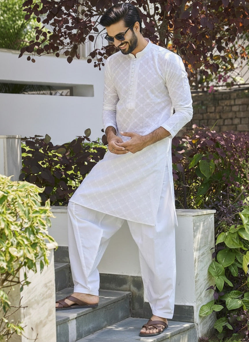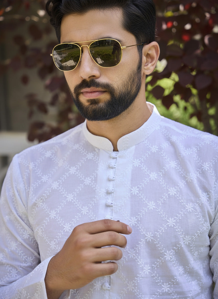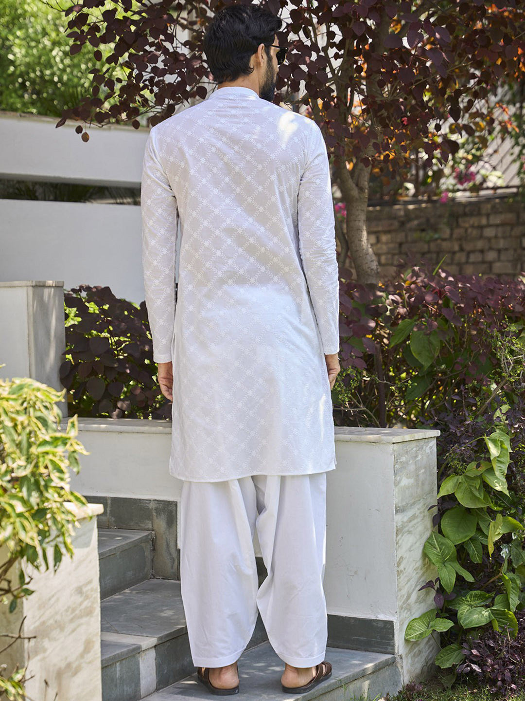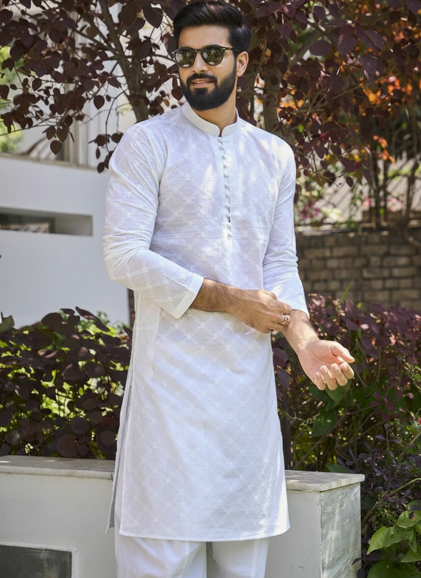 Elevate your ethnic wardrobe with this elegant white woven chikankari cotton kurta. Featuring delicate embroidery, a refined mandarin collar, and an empire-style straight cut, it blends traditional craftsmanship with modern simplicity. Designed in pure cotton with calf-length comfort and side slits for easy movement, this kurta is lightweight, breathable, and perfect for both casual gatherings and festive occasions. Its timeless white hue adds versatility, making it a must-have piece that pairs effortlessly with churidar, pyjama, or even jeans for a fusion look.