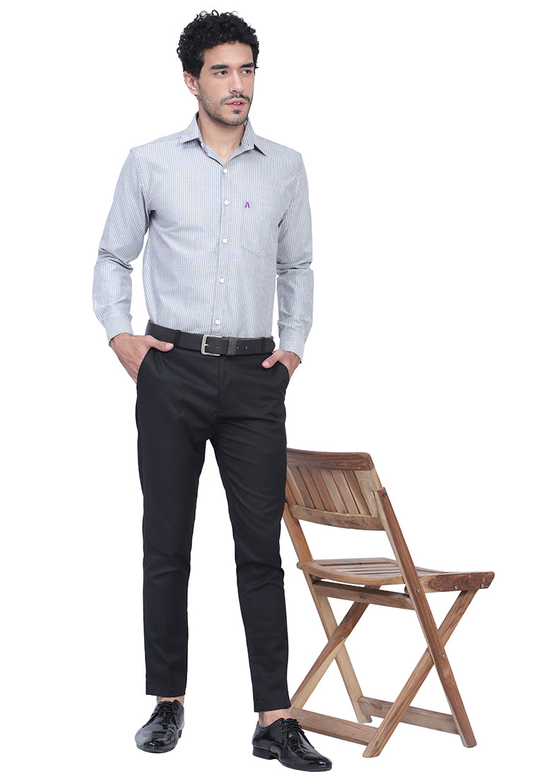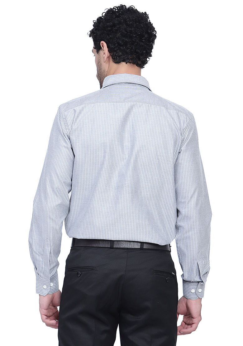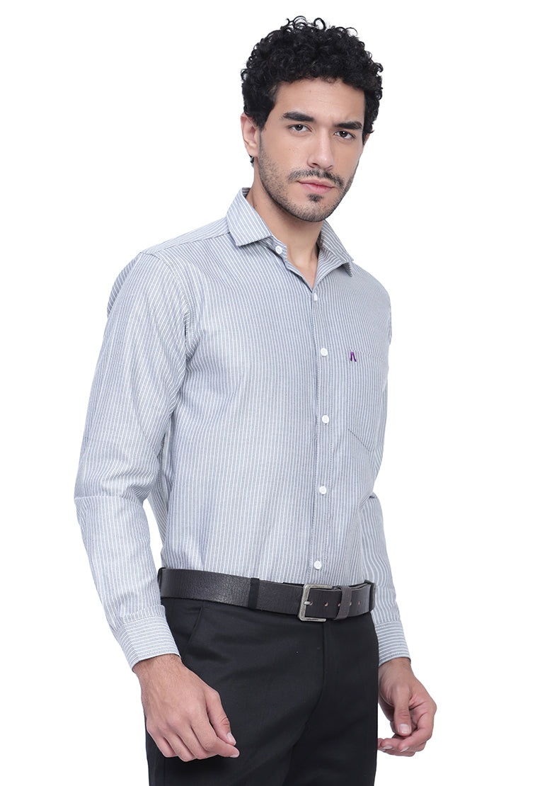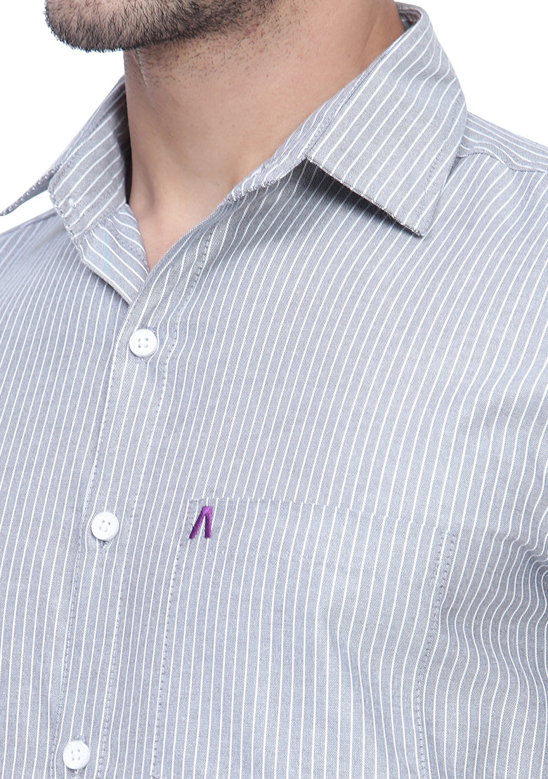 Dress impeccably with a Striped Full Sleeve Shirt for men. Designed with Grey stripes, it's a wardrobe essential. The shirt features a spread collar, full sleeves, and a comfortable regular fit. Crafted from a high-quality Cotton Blend fabric, it's stylish and comfortable.