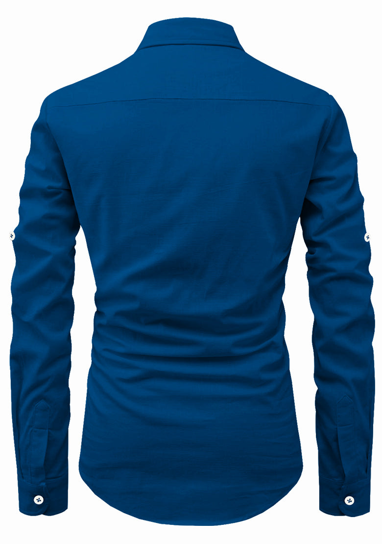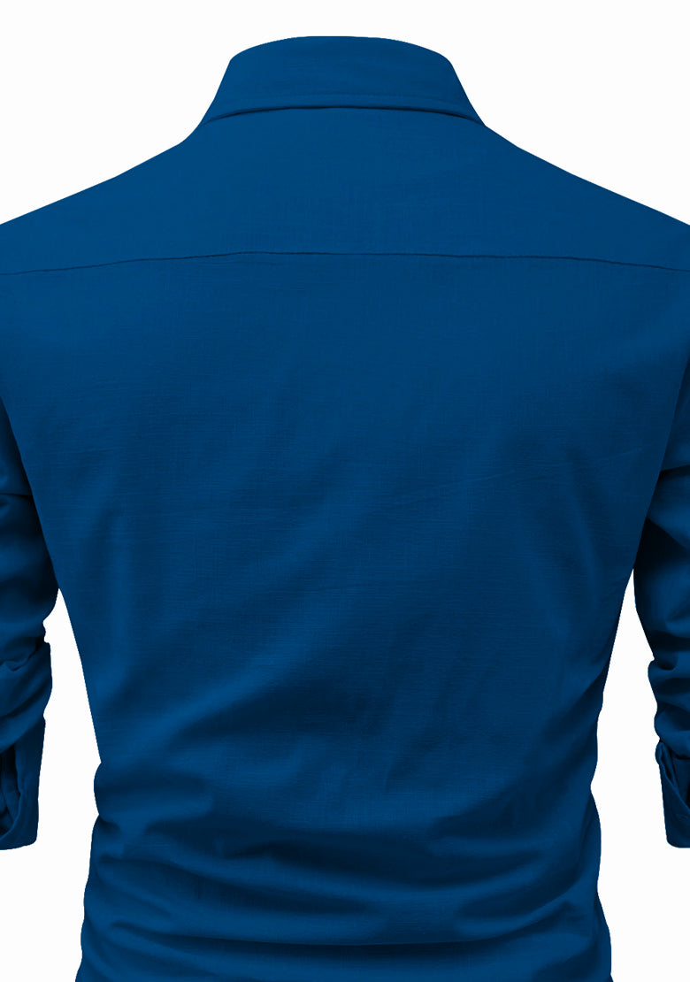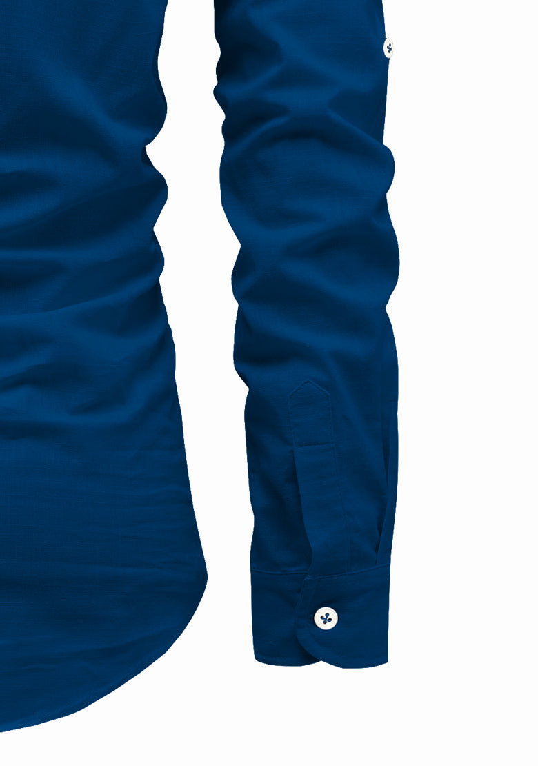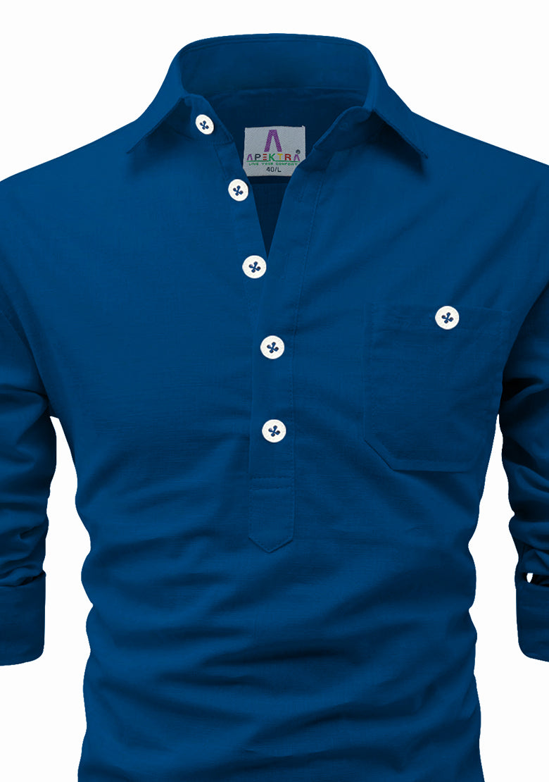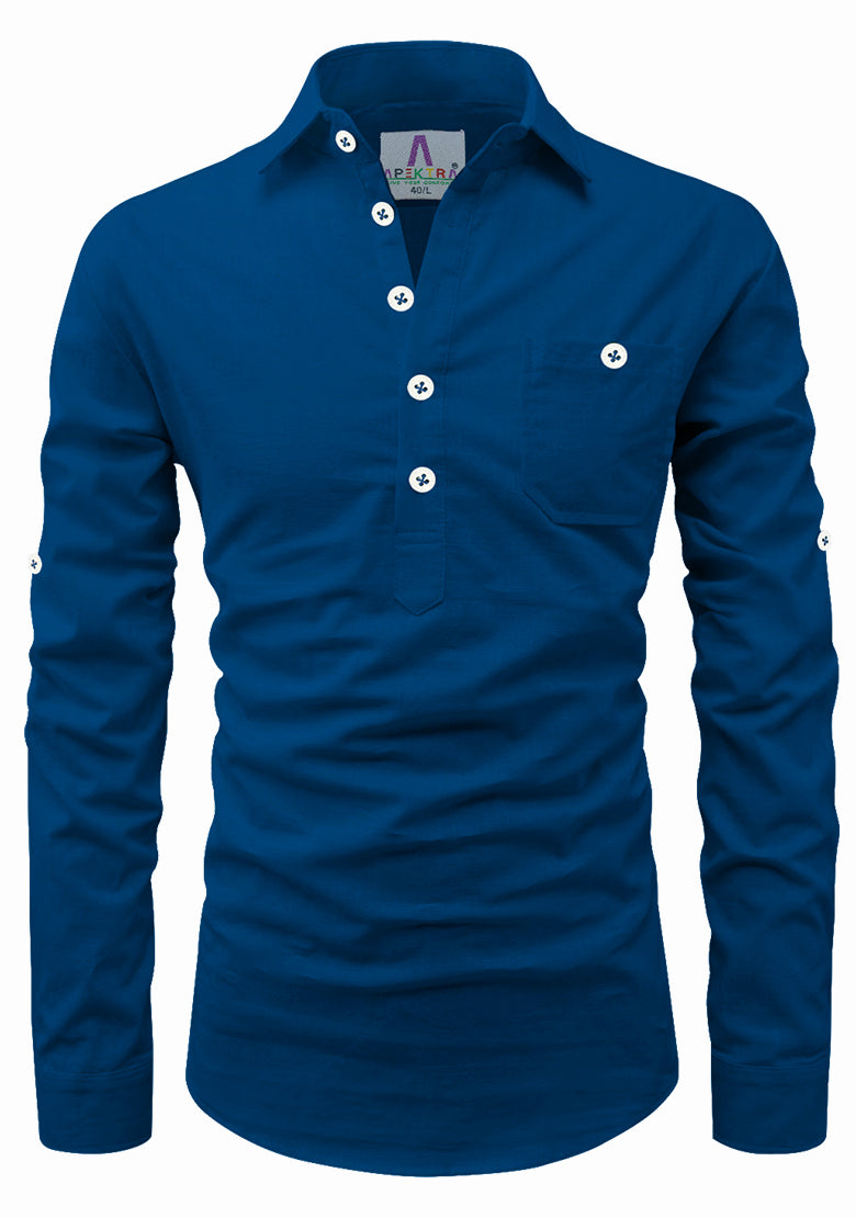 Men's Cotton Fabric Roll Up Sleeve Spread Collar Royal Blue Kurta