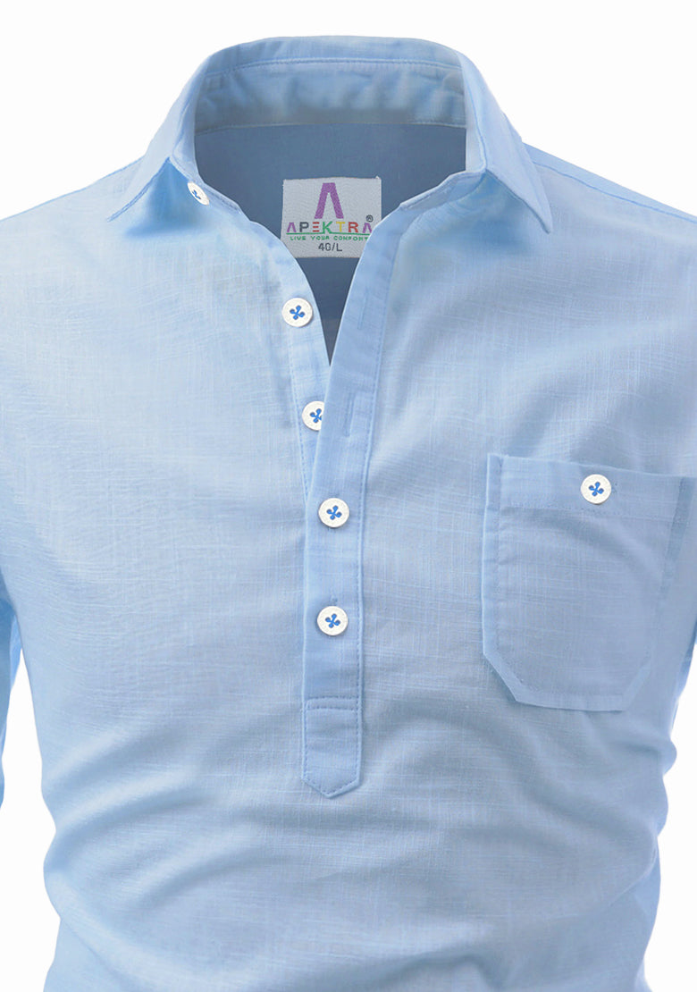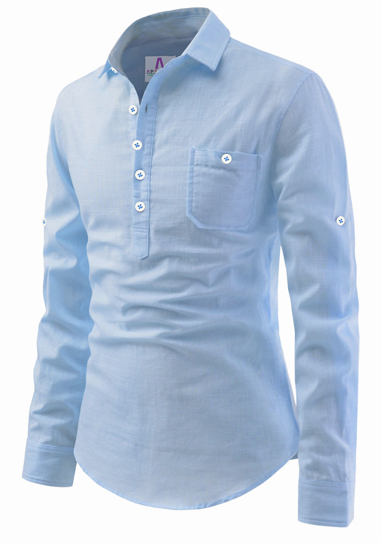 Men's Cotton Fabric Roll Up Sleeve Spread Collar Sky Blue Kurta