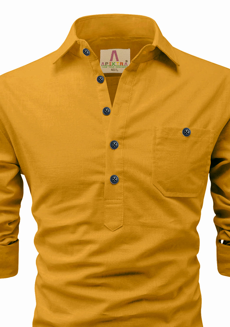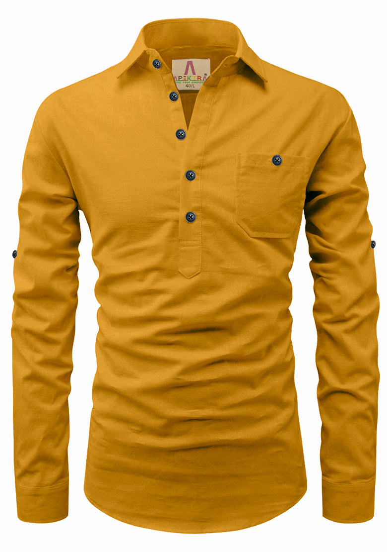 Men's Cotton Fabric Roll Up Sleeve Spread Collar Yellow Kurta